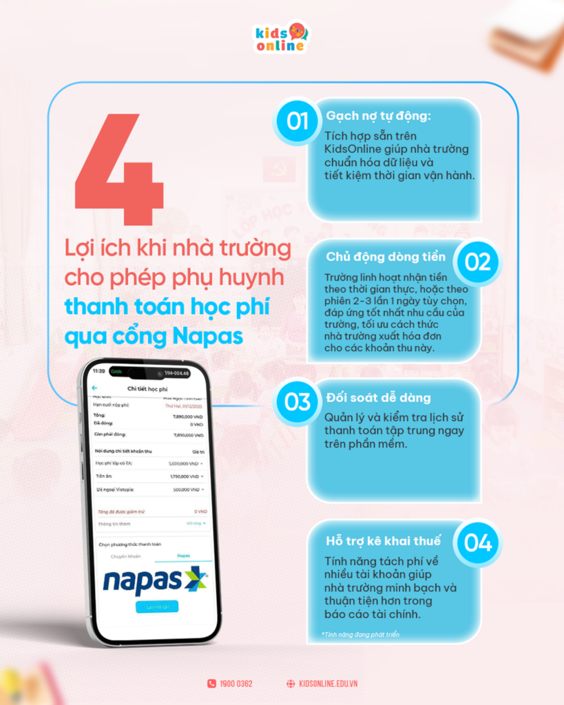Việc tích hợp thanh toán học phí qua cổng Napas không chỉ giúp nhà trường hiện đại hóa quy trình thu phí mà còn góp phần xây dựng hệ thống quản lý tài chính minh bạch và chuyên nghiệp. Với giải pháp này, KidsOnline tiếp tục đồng hành cùng các trường mầm non trong việc tối ưu vận hành và nâng cao trải nghiệm cho phụ huynh trong quá trình thanh toán học phí.